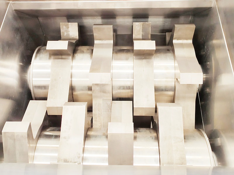 工作过程或原理:主要含有两根辊:金属辊和废金属辊。减速电机带动非金属辊转动,在两辊的另一端设有一对同步齿轮,通过齿轮啮合使得两辊相对转动,两辊的截面形状一般为五角星形。物料进入两辊之间,通过两辊的啮合完成挤压破碎功能。